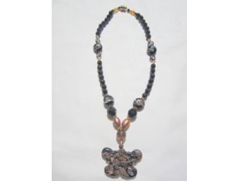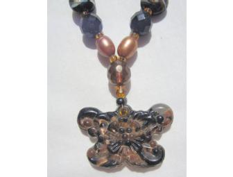One of a kind, hand crafted necklace features faceted Black Onyx, Pearls and Smokey Topaz with Art Glass Butterfly. Magnetic Clasp, and unique artist class accents stones make this stunning necklace perfect for adorning your favorite cocktail dress or favorite suit for day time too!