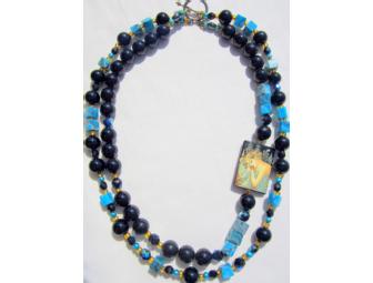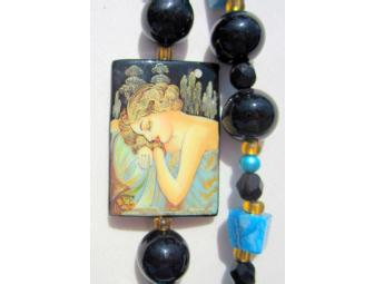 DOUBLE STRAND NECKLACE FEATURES HAND PAINTED ART PENDANT FROM RUSSIA, OODLES OF CARATS OF GENUINE BLACK ONYX AND TURQUOISE, AND ACCENTS OF CRYSTALS TOO!