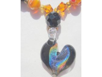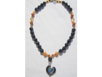 Handcrafted, one of a kind necklace features large faceted black onyx beads, real golden citrine and accent crystals; toggle clasp and dangling irredescent blown art glass HEART!