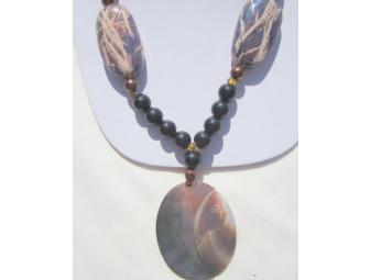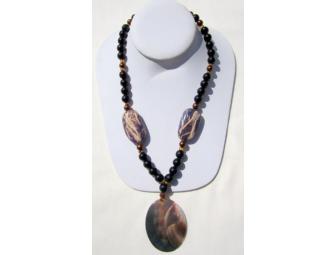 ONE OF A KIND, HAND CRAFTED NECKLACE FEATURES CARVED MOTHER OF PEARL PENDANT, BLACK ONYX BEADS AND PEARLS WITH UNIQUE ART BEAD ACCENTS.