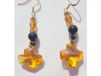 Feature 'ART GLASS' dangling Golden Crosses, Genuine ONYX, and crystal beads