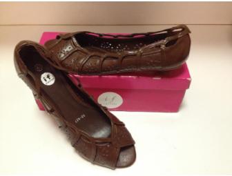Tan 1-inch heels. Punched faux leather. All man-made materials. Size 8 1/2.