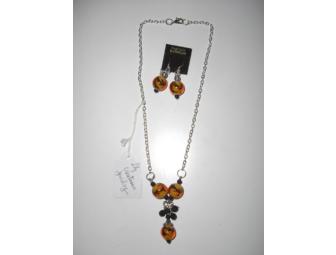 White beads encircled by a delicate leaf pattern and encased in amber glass. Accented with silver bezel and dark cut glass beads. Necklace and matching earrings. Handmade by Lily Creations Jewelry