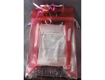 MERLE NORMAN trial-sized revitalizing treats including facial wipes, micro refiner, brilliant C-moisturizer, Brilliant C-eye cream and Brow Wax, all tucked in a minty green double-pocket bag.
