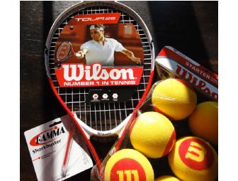 Kids REBEL 25 Tennis racquet with Fusionlite-alloy I-Beam by Prince. Also included is Hand Print Overgrip to absorb sweat and prevents slipping plus Shockbuster a racquet vibration dampener; both by Gamma.