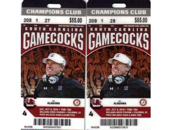 Four seats in the exclusive Champions Club South at Williams Brice Stadium for the USC-University of Alabama Birmingham football game on Sept 15, 2012. Indoor/outdoor seating, high def TV's. Tickets will be mailed to the winning bidder a week or two before the game.