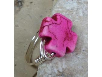 This size 7 ring is handmade with silver plated wire and a howlite cross bead.