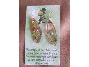 Circa May 2011-remember the overwhelming invasion of the cicadas? These unique earrings are handmade from cicada wings. Smooth to the touch and enhanced with a dangling stone. Silver posts.