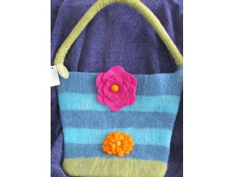 Cheery "boiled-wool" floral/striped hand-bag. Approximately 12" bag without handle...very roomy! Hand crafted by Midwest CBK in Nepal.