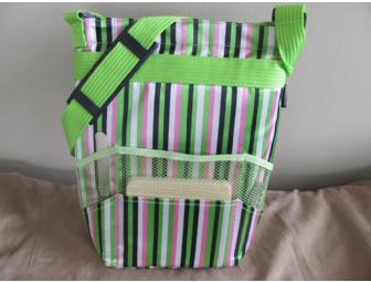 Classy sateen pink, black, white & green striped insulated tote has front pocket and comes complete with cutting board, knife and cork screw. Velcro closure.