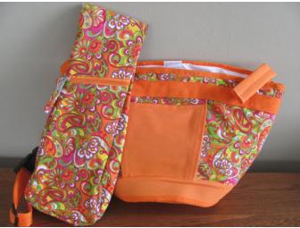 Brightly colored floral/paisley pattern adorns this awesome insulated wine tote with zippered pocket on front (perfect for corkscrew storage) and adjustable strap. Paired with a matching portable cooler...just add ice and beverages! Cooler has front pocket which opens via velcro for monogramming.