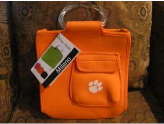 This chic, insulated tote in Clemson orange is perfect as a lunch bag, purse, make-up bag, or poolside necessities tote. Made from heavy-duty form-fitting neoprene fabric, has insulated lunch compartment as well as a drink compartment which holds 2 small cans or 1 0.5L water bottle, zippered closure, sturdy plastic handles, and exterior utility pocket. It sports a tiger paw for that Clemson spirit!