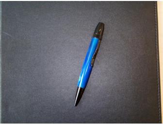 Scribe your correspondence in style! Handmade blue polyester acrylic pen measuring 4 3/4" long. Takes a standard "Parker" style ink replacement cartridge.
