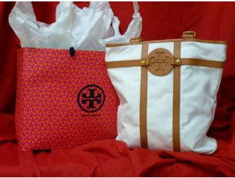 Get styling with a white Tory Burch canvas tote, featuring genuine leather straps, and signature leather logo. The tote measures approximately 13 1/2" tall by 12" wide.