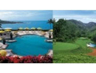 Four Seasons Resort Lana'i, The Lodge at Koele – This resort offers dynamic sporting adventure in the green central highlands. Infused with upcountry plantation charm, the resort’s luxurious rooms offer residential-style furnishings and colorful décor inspired by the natural surroundings. Every room has ceiling fans, paintings by local artists, a cozy window seat and carved pineapple finials on the two-poster bed. Relax on the spacious lanai‘s rustic outdoor furniture and enjoy the crisp highland air. Tranquil vistas encompass a mix of views over the lush gardens, Orchid House, Pagoda, reflecting pond, riding stables and an old Hawaiian church. The resort includes a state-of-the-art fitness center, swimming pool and two whirlpools, three tennis courts, a highlands center complete featuring a 14-station sporting clay course and archery range, and equestrian stables offering gentle horses for all levels of trail riding. The Experience at Koele championship golf course, 2,000 feet above sea level and designed by Greg Norman and Ted Robinson, offers dramatic contrast from Manele with a cooler climate, wooded slopes, manicured bunkers and terraced water hazards. Blackout dates: December 19, 2011-January 1, 2012.