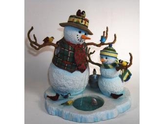 Part of the ceramic Lenox Snowman Collection by the artist Lynn Bywaters, handcrafted in China, featuring a grandpa and boy snowmen at a fishing hole. They are accompanied by 11 brightly colored feathered friends. Grandpa snowman has a spool of fishing line on one arm going into the water. There's even a fish peeking out of the water. It’s about 7.5 inches high and the base measures 6 by 7.25 inches.
