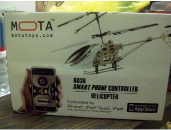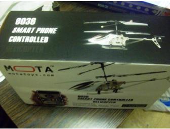 In the box: Mota helicopter, two spare rotor blades, two spare tail propellers, transmitter, USB charge cord