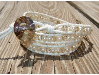 This amazing bracelet features gorgeous 4mm cream colored Swarovski pearls and Swarovski crystal beads in the shade of "Golden Shadow." They are woven to cream colored 2mm cotton cord. It also has a 14mm Swarovski Crystal Golden Shadow button clasp.