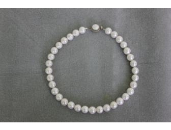 One of a kind hand crafted 12mm pearls are strung on a wire and finished with a mother-of-pearl clasp, for a very classic look. The length at 17” is choker style and works with many clothing neck lines.