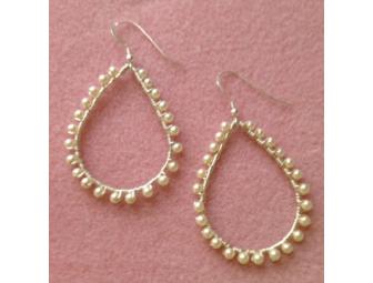 Round seed pearls are handwrapped with sterling silver wire around a sterling silver tear drop frame. Ear wires are also sterling silver and have a tiny bead which will show right at the top of the tear drop frame, completing the frame of round pearls.