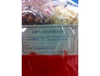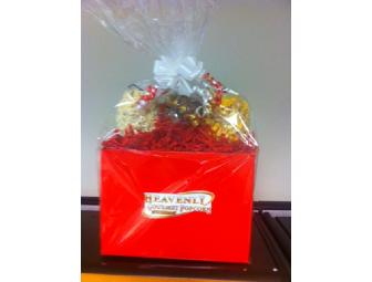 3 bags of Heavenly Gourmet Popcorn in a gift wrapped package along with a $20.00 gift certificate for more popcorn!