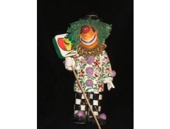 This statue was purchased in Italy and stands about 13 inches tall. The clown has a black derby hat, green hair and an orange face. The shirt is flowered and the pants are are a black and white checkered pattern.