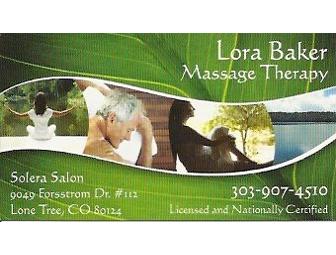 One hour massage with Lora Baker. Solera Salon, 9049 Forsstrom Dr., Suite 112, Lone Tree, CO 80124.