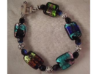 Beautiful glass over silver foil beads in the style of Venetian art glass make this bracelet a jewelry box favorite! Basic black square shaped beads are wrapped in silver then wrapped again with another glass overlay to add interest and tonal shade color to this comfortable beauty. Sterling silver findings and czech crystals complement the colors in this bracelet. Matching black glass earrings with a dimensional silver swirl wrapped around are sure to become a favorite accessory to coordinate with your wardrobe favorites, both casual and dressy. This enticing jewelry duo incluced a 7.5 inch bracelet and matching earrings. The essence of Deb Rich's artistic expression is revealed in each lampwork bead that she creates in her studio. Deb's beads exhibit her desire to create and inspire change through community outreach. These jewelry pieces are offered exclusively through cMarket to support the fundraising efforts of non-profit organizations. Lampwork glass reflects both the heartfelt passion and interpretative expression of Deb Rich. Her artistic resume includes fantasy sculptures, creatively fashioned from found-objects and recycled materials. Deb's Glass Designs are truly hypnotic, one-of-a-kind pieces that cannot be replicated or manufactured by a machine. Deb only sells jewelry pieces that capture the grace and flow of glass artistry. All jewelry is made with sterling silver or copper findings, Czech or Swarovski Crystals, and various complementary beads, making Deb's Glass Designs positively the best choice.