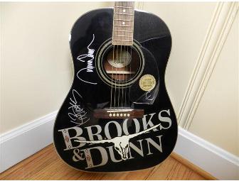 Includes: Epiphone Brooks & Dunn Signature Edition Acoustic Guitar signed by Brooks & Dunn. The undisputed kings of the '90s line-dancing craze, Brooks & Dunn are not only the biggest-selling duo in country music history, they've also sold more records than any other duo period, save for Simon & Garfunkel. Ronnie Dunn was the quietly intense singer with the soulful voice, while Kix Brooks played the part of the high-energy showman. Neither had been able to break through as a solo act, but together they hit upon a winning formula of rambunctious, rocked-up honky tonk with punchy, danceable beats, and alternated those cuts with smooth, pop-tinged ballads. The combination made them one of the most popular country artists of the '90s, and they were still going strong as the new millennium dawned. Throughout the late '90s and early 2000s, the duet toured and recorded extensively, releasing "Tight Rope' in 1999, "Steers and Stripes" in 2001, "Red Dirt Road" in 2003 and "Hillbilly Deluxe" in 2005. In 2001, their song "Only In America" became a sort of anthem for a disillusioned country after the September 11 terrorist attacks. Own a piece of this classic American duo with this signed guitar today! Estimated Retail Value of over $1000. Accompanied by a Certificate Of Authenticity from 2011 UACC Autograph Dealer Of The Year and UACC Registered Dealer #237 along with lifetime guarantee of authenticity. It simply does not get any better than this.