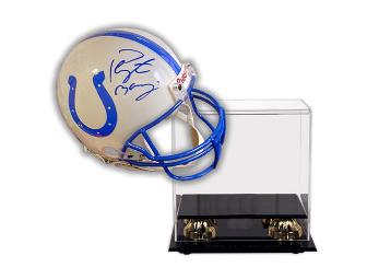 Bids are for a limited edition Peyton Manning hand-signed official full size authentic Indianapolis Colts game helmet with a deluxe display case. Peyton Manning of the Indianapolis Colts currently holds the NFL record for most passing touchdowns in a single season with 49 in 2004. Manning has received numerous accolades for his play, including seven Pro Bowl selections, NFL MVP in 2003 and 2004, 2004 Offensive Player of the Year and 2004 Pro Bowl MVP. Manning led the 2005 Colts to 13 consecutive wins, a 14-2 record, and contributed an exciting 50-yard touchdown pass in the divisional playoffs. Certificate of Authenticity included.