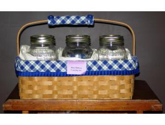 Longaberger gift basket with 3 mason jars and blue/white plaid cloth liner