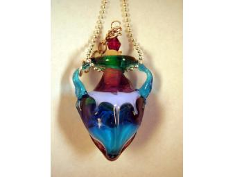 Many stories tell the significance of draping a vessel around one's neck. Our favorite is that a vessel is for keeping your life's passions safe. This graceful necklace includes an 18 inch chain. This fun and fashionable jewelry piece is sure to capture attention when you walk in any room. Make this unique jewelry piece a favorite in your accessory collection today! The essence of Deb Rich's artistic expression is revealed in each lampwork bead that she creates in her studio. Deb's beads exhibit her desire to create and inspire change through community outreach. These jewelry pieces are offered exclusively through cMarket to support the fundraising efforts of non-profit organizations. Lampwork glass reflects both the heartfelt passion and interpretative expression of Deb Rich. Her artistic resume includes fantasy sculptures, creatively fashioned from found-objects and recycled materials. Deb's Glass Designs are truly hypnotic, one-of-a-kind pieces that cannot be replicated or manufactured by a machine, so items might vary slightly from the photo. Deb only sells jewelry pieces that capture the grace and flow of glass artistry. All jewelry is made with Bali style findings, Czech or Swarovski Crystals, and various complementary beads, making Deb's Glass Designs positively the best choice.