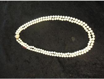 A double strand (22") of 6mm hand knotted pearls with 14k yellow clasps.
