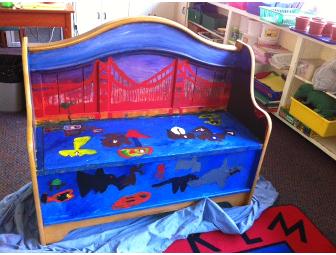 This Golden Gate masterpiece will brighten up your home and be a joyful place to rest or at least to hide your shoes! The Tiger Cubs used acrylic paints to decorate this storage bench with sunset colors in the sky behind the bridge, sailboats by each JK student complete with little faces peeking out of portholes, and creatures from the deep in the fathoms below!