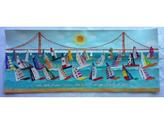 Enjoy the SHS 3rd grade class students racing against each other at the 2013 America's Cup with the Golden Gate Bridge as a background. Each child has created their own boat in his or her favorite colors. The boats display the childrens names and class number.
