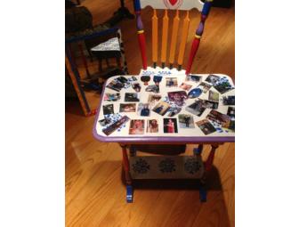 The 8th grade project this year is a joint effort of all 13 students! Joe, Ryan, Talia, Shayda, Dempsey, Anne, Justin, Daphne, Preston, Jacob, Chase, Hannah and Nickworked collaboratively to prime and paintthree pieces of furniture: a beautiful old fashioned colorful wooden chair, a cute wooden desk with pull out drawers, and a wood framed mirror. The desktop is a collage under glass of all the 8th grade students in their uniforms, dressed up and out in nature. The chair back is adorned with the signature "wings" of the 8th graders sweatshirt design. A bright colorful mirror is also included to round out the trio of unique furniture. Anyone would enjoy this colorful trio to brighten up their home and reminisce about St. Hilary School. Smile and enjoy.