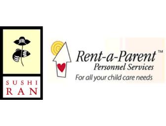 It's time for a night on the town! Dine at the everyone's favorite-Sushi Ran- with this gift certificate worth $100.00. Leave the babysitting to Rent-A-Parent and receive four hours of childcare for 1-2 children (agency fee included in package).
