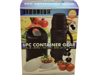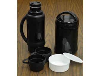 Picnic basket, 4 plates, 4 white cups, 4 sets of utensils, 4 tumbler acrylic glasses, a red checked picnic tablecloth with clips, 4 colorful cotton napkins, $40 in gift certificates from Jacob's Meat Market (located in Appleton, Wisconsin), 6 pc. thermos set, a grilling tongs, grilling fork and grilling basting brush, mustard, pickles and olives, guacamole flavored chips, a corkscrew, a Wham-o blue frisbee, 4 tea towels and a bottle of pump soap for quick clean-up, and a bottle of bubbles!
