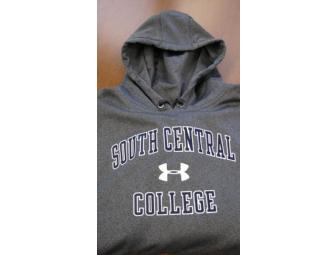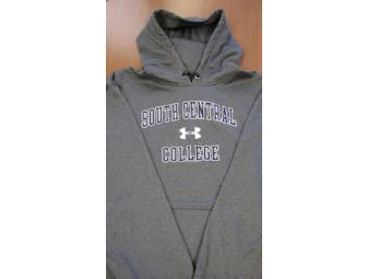 Under Armour hoodie with South Central College on the front in blue and white lettering. Gray color. Size XL.