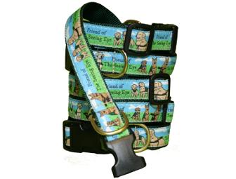 This Seeing Eye Leash and Collar have been developed exclusively for The Seeing Eye by Up Country. The attractive design illustrates the growth of Seeing Eye® puppies – from puppies to partners. Each item features three distinct phases of development shown with German shepherds, Labrador retrievers, and golden retrievers. From young puppies with green “Puppy in Training” bandanas to older pups with green vests and finally the same pups as adult dogs in harness, this design is a tribute to Seeing Eye puppy raisers, instructors and graduates. The words "Friend of The Seeing Eye" appear in black text between the images of the dogs. Each item is constructed of high tensile dark green nylon webbing with decorative stain and fray resistant ribbon. The hardware is cast solid brass; quick release buckles are extra sturdy.