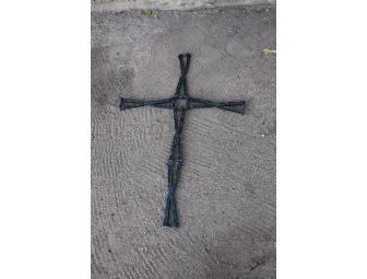 Greg created this unique cross by welding 20 railroad spikes together. This cross makes a stunning statement. Greg's work can also be found at Pop-Cycle.