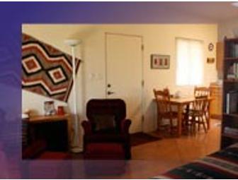 Two beautifully furnished rooms are available in this charming Santa Fe ranch home. Each has a private bath and fully equipped kitchen. Refrigerator, stove, oven, microwave, toaster, pots, pans, dishes, glasses, utensil, towels, and linens are supplied. One room has a king bed with two sitting chairs; the other a queen bed with two sitting chair and two director chairs. TV/VCR combos are in each room. Both rooms enjoy a grand view of the distant valley of Sonora, Mexico.