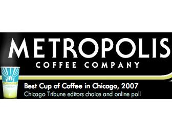 A coffee and tea basket from our neighbors at Metropolis that includes two pounds of of coffee, one tea tin, and two ceramic mugs.