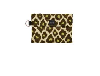 KARI-Meow in a medium weight fabric with a dark brown flocked cheeta print that outlines an apple green center making the perfect little catch-all accessory!