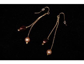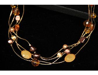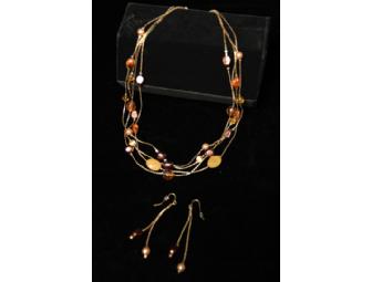 Two strand gold and amber tone bead earrings. Approx 3.125" L. Gold and amber toned necklace. Longest strand is 24". Loster claw clasp.