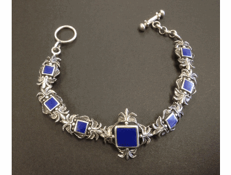 Sterling Bracelet inlaid with lapis lazuli. Intricate pictorian style silverwork. Made in India