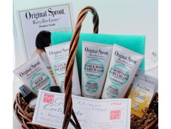 Basket of Original Sprout products: natural shampoo, deep conditioner, hair& body babywash, scrumptious baby ceam, miracle detangler, Tahitian hair oil, Island Bliss shampoo, Luscious Island conditioner,natural curl calmer, natural hair gel, exfoliating green wash towel.