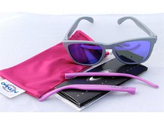 One (1) pair of fun, stylish, purple and pink Frog Skin Oakleys with interchangeable polarized lenses. These glasses are lightweight, durable, and have a high quality fit.