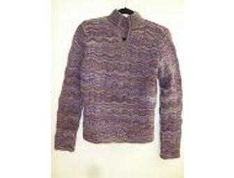 Beautifully handknit from 100% striated dyed wool, this pullover sweater features shades of violets, green, and olive of Crystal Palace Taos yarn.