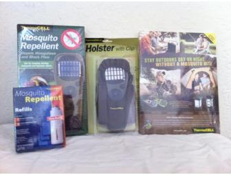 One mosquito repellent appliance- silent & portable it repels mosquitos and black flies (it contains 1 reusable appliance, 1 butane cartridge and 3 insect repellent mats), one repellent refill and holster with clip.